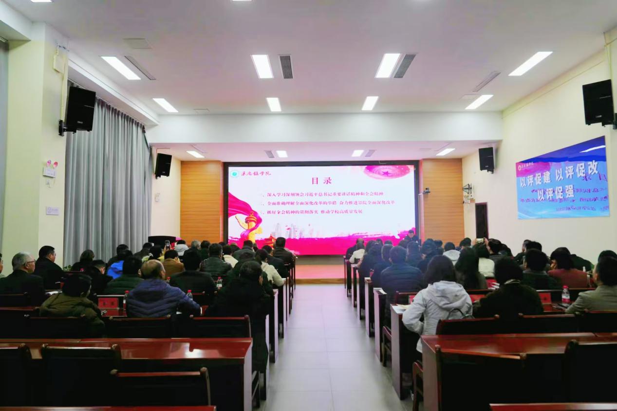熊震宇围绕学习领会习近平总书记重要讲话和全会精神,结合学校改革工作实际,从“深入学习深刻领会习近平总书记重要讲话精神和全会精神”“全面准确理解全面深化改革的举措,奋力推进景院全面深化改革”“抓好全会精神的贯彻落实,推动学校高质量发展”三方面授课。