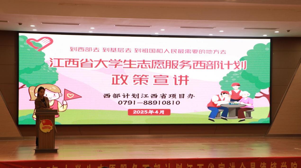 (本网讯:张琳)为切实加强西部计划工作交流,为广大毕业生提供深入了解西部计划的咨询解读和互动的机会,4月17日下午,大学生志愿服务西部计划江西省项目管理办公室组织省级宣讲团在我校举办宣讲会,引导和鼓励我校学子投身西部建设,到基层去、到祖国和人民最需要的地方建功立业。各二级学院团委负责人及2025届毕业生代表等近300人共同参会。