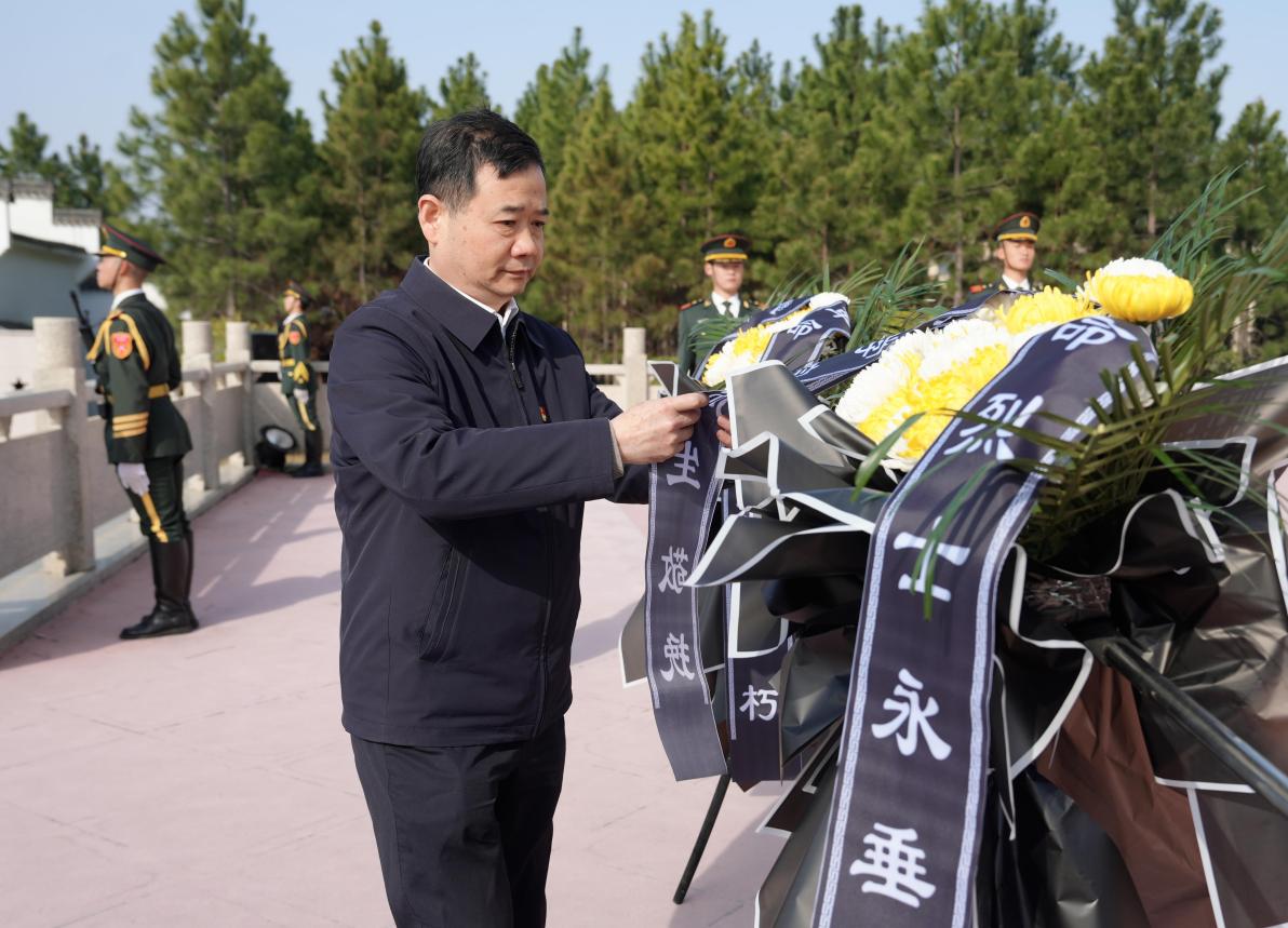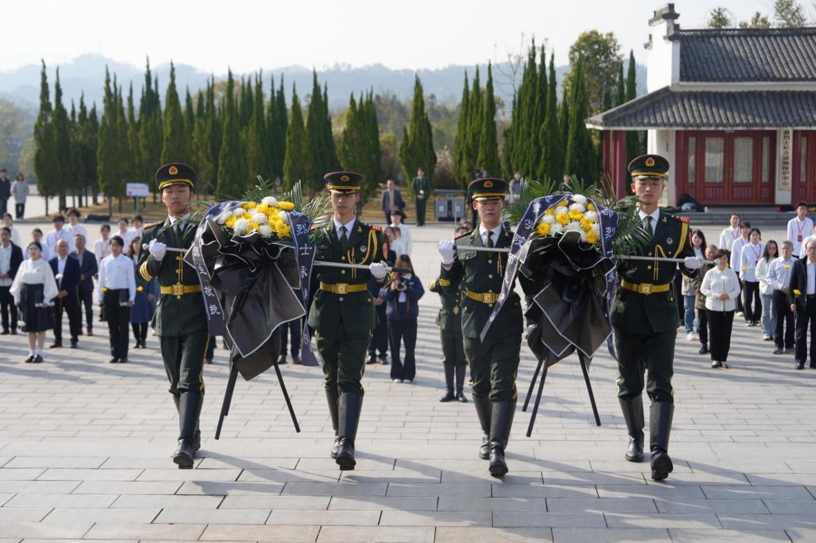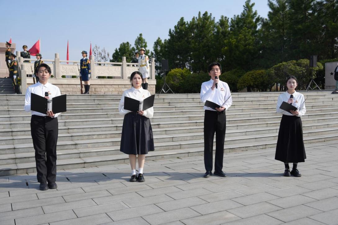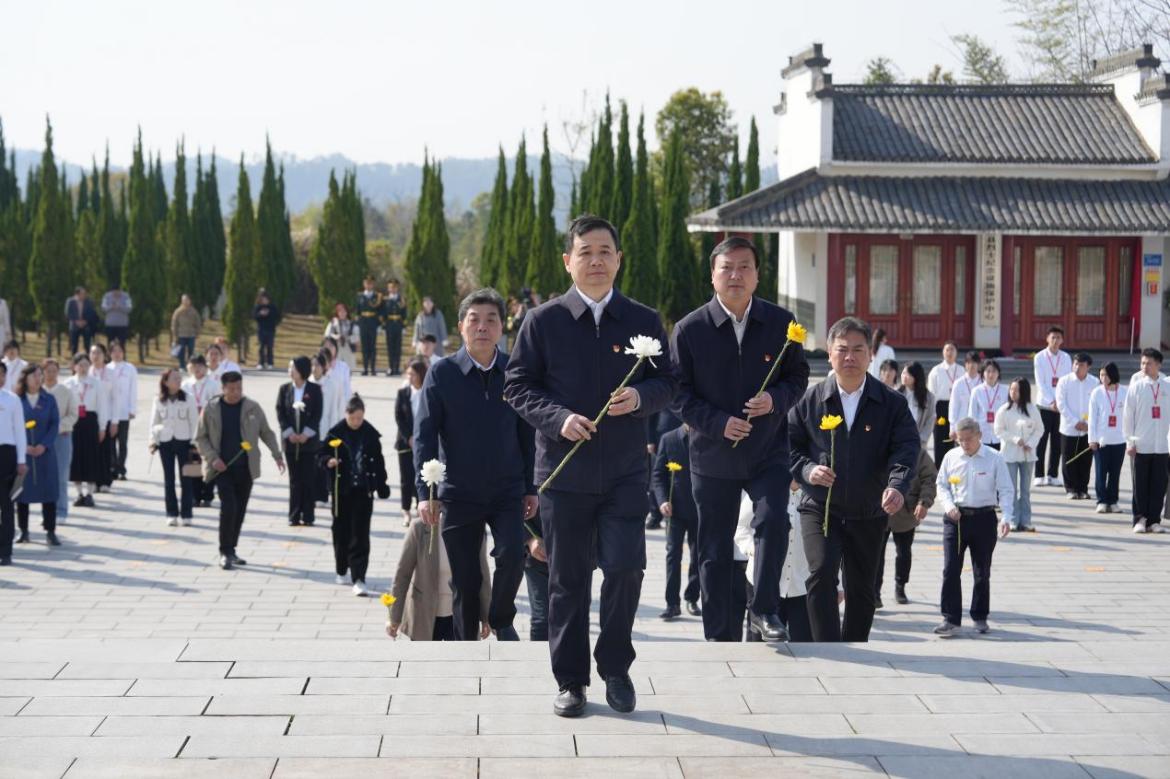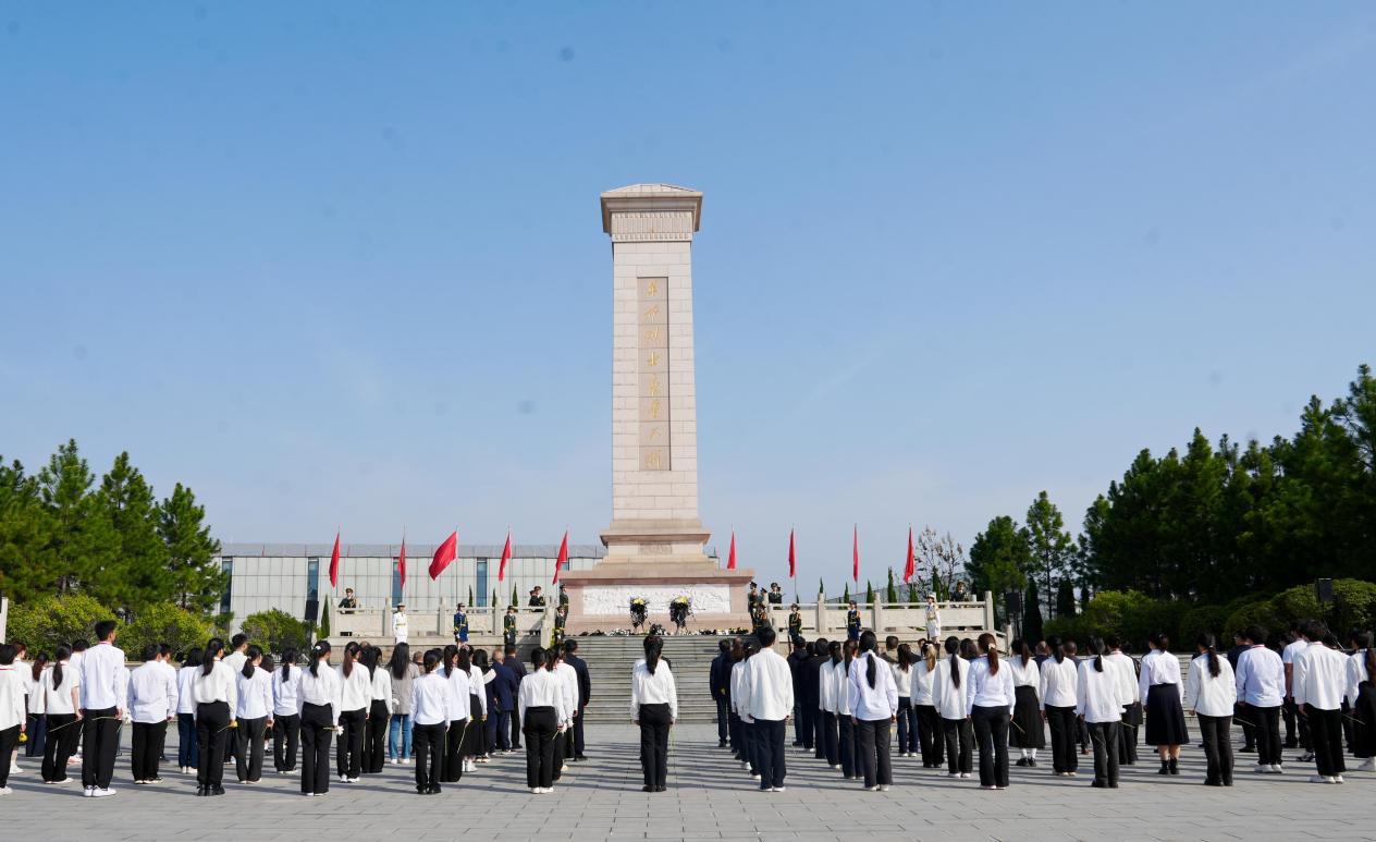 烈士陵园内松涛低回。国歌激荡云霄,师生方阵肃立如林。国旗护卫队步伐庄重沉凝,将缀满白菊的花篮敬献于纪念碑前。“革命烈士永垂不朽”缎带辉映朝阳,校党委副书记、校长熊震宇抚平缎带,三鞠躬间尽显追思。