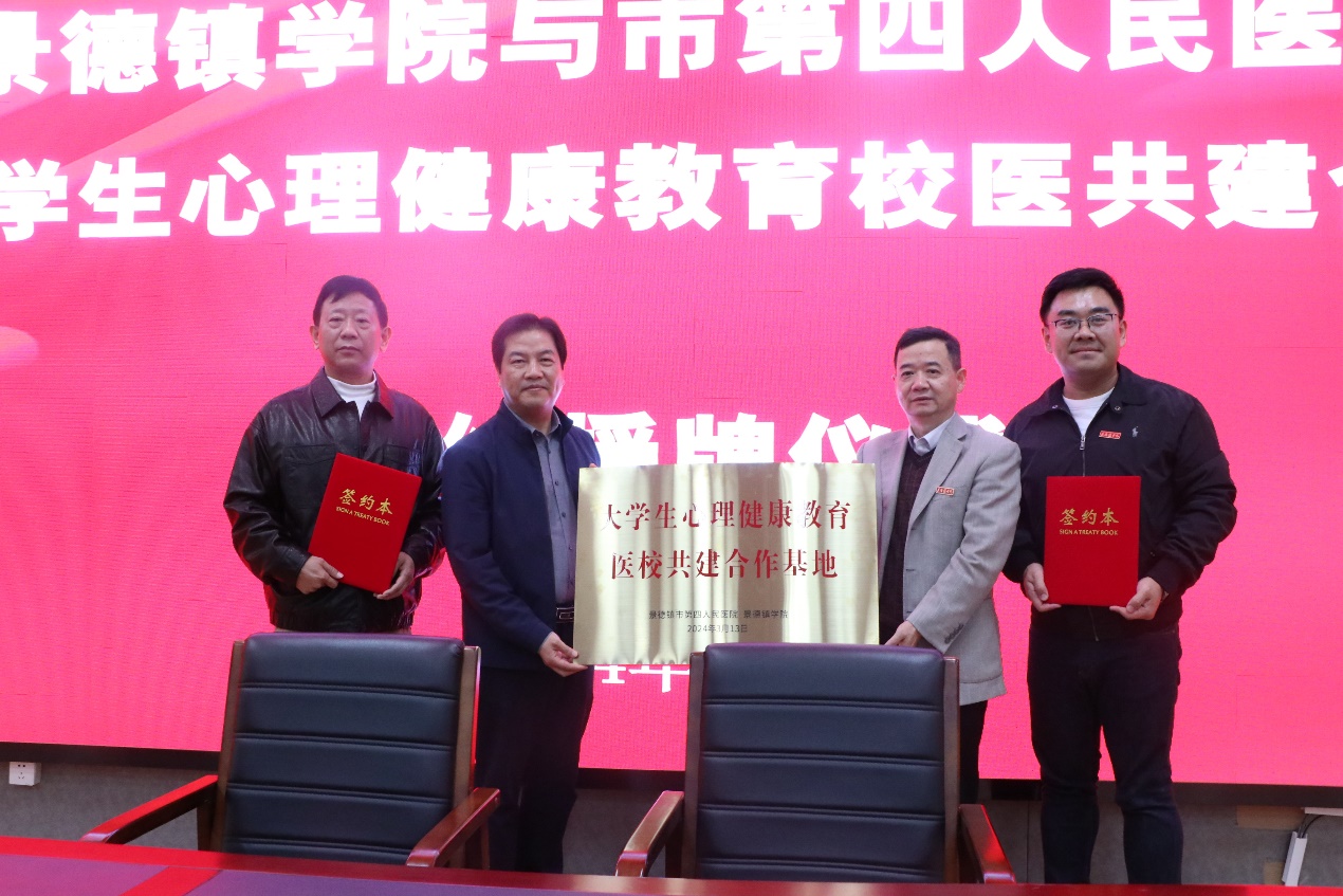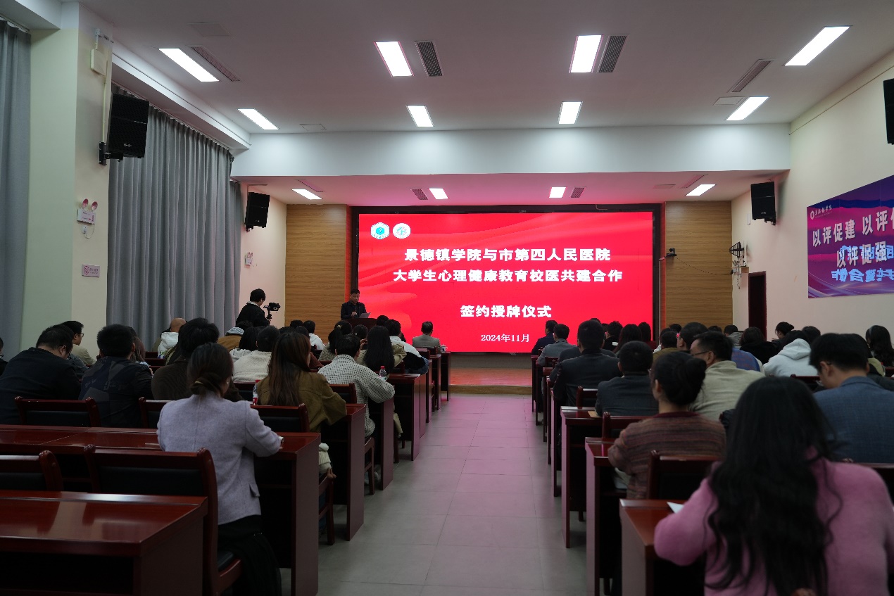 (本网讯:文|朱小薇/图|童炜轶、毛玉婷、黄鑫)为提升学生的心理健康水平、加强心理危机干预能力、推动心理健康教育普及以及构建全方位心理健康支持体系,提供更优质的专业医疗服务,11月20日下午,景德镇学院与景德镇市第四人民医院校医心理健康教育合作共建的签约授牌仪式在第一报告厅举行。党委副书记、校长熊震宇,景德镇市第四人民医院院长施振岗出席会议,双方签署了合作协议,校心理教育中心主任郑勇军主持仪式。