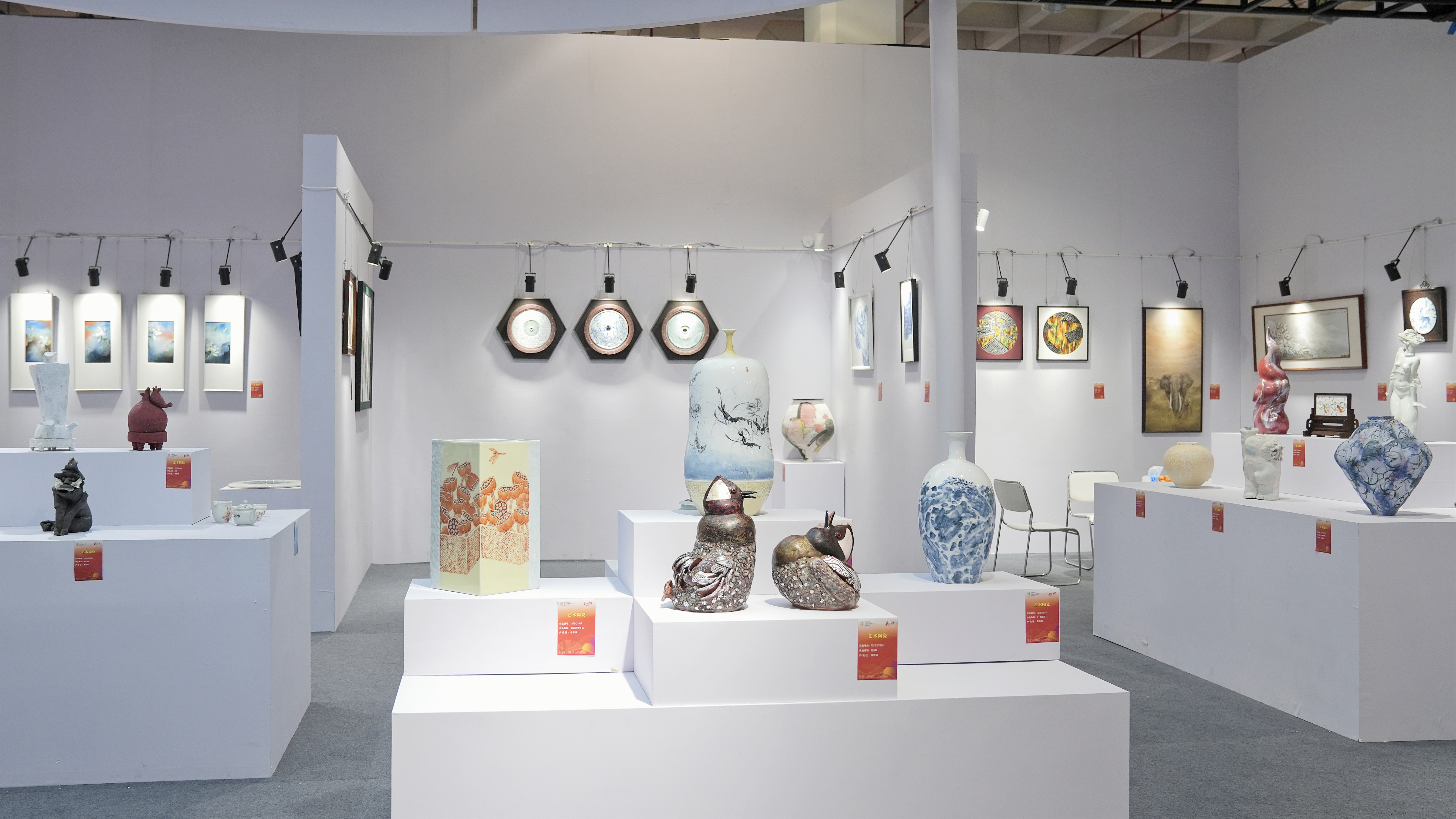 展会中,我校52件教师陶瓷艺术精品参展,展台设计风格简洁大气,精美的艺术品融入其中,错落有致,集中展现了我校教师风采。校党委委员、副校长方漫来到现场指导工作,陶瓷美术与设计艺术学院院长张博、党委副书记胡文毅、副院长程幸携教师团队组织展览布展等工作,并积极向前来观展的嘉宾做展品介绍。