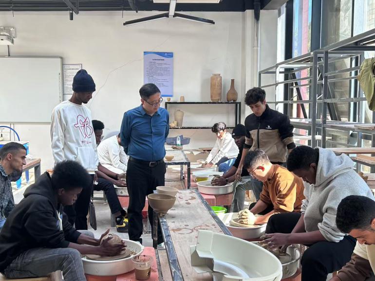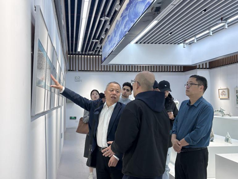 仪式结束后,令狐文生一行参观了我校美术馆、陶瓷美术与设计艺术学院一楼展厅、陶瓷美术与设计艺术学院实训中心,并进行了拉坯体验。