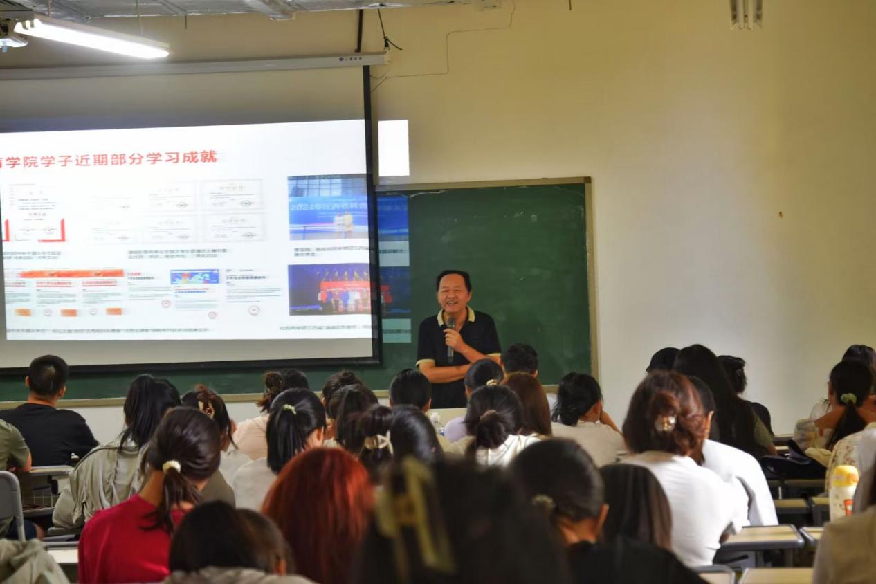 (本网讯:文|姚茜/图|刘燕敏)为深化爱校荣校教育理念,增强2024级新生对学校历史和文化的认同感,树立正确的人生观、价值观和世界观,校关工委开展新生爱校荣校教育系列讲座。9月9日下午,校关工委副主任曹品生教授在教育学院一楼多媒体教室开展爱校荣校教育讲座。教育学院党委副书记冯唐锴主持讲座。