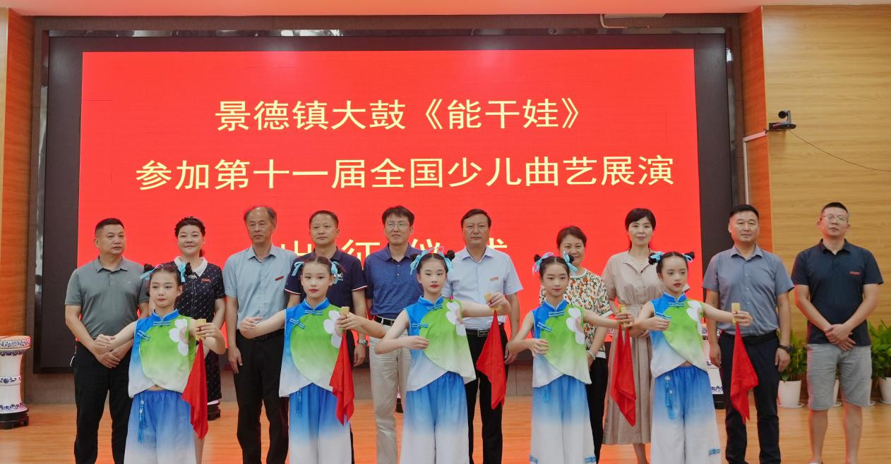 仪式上,浮梁县一小学生代表刘嘉越同学作发言,与会领导为《能干娃》参演学生颁发纪念品。出征仪式在小演员们生动活泼的景德镇大鼓表演《能干娃》中落下帷幕。