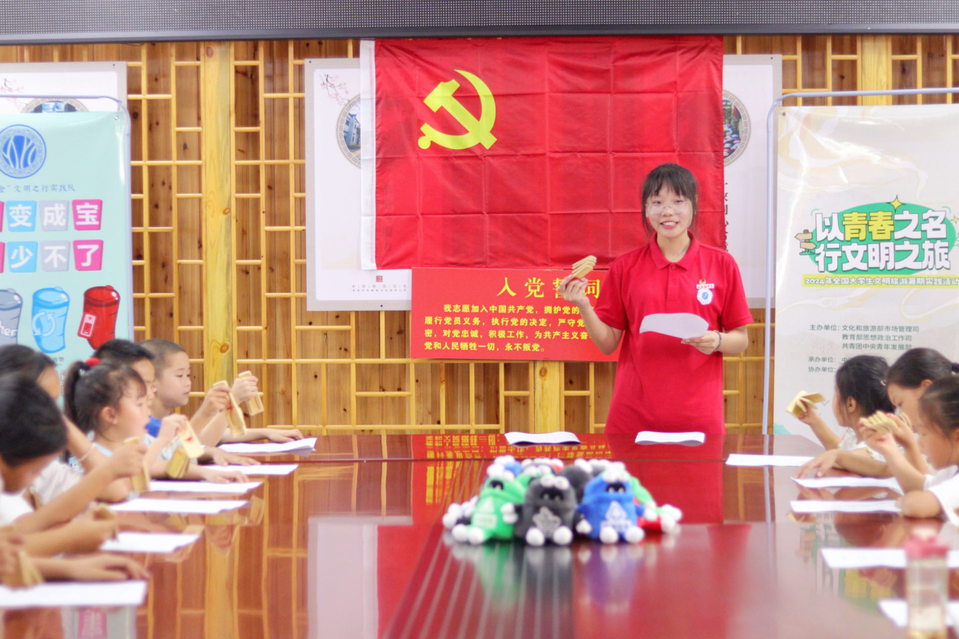 在调研走访的过程中,实践队成员了解到村里存在部分留守儿童,为助力乡村振兴,进一步提升农村留守儿童幸福感,实践队成员结合所学专业和石门自然村的实际情况,以生态优先、绿色发展为理念,精心设计课程结构,创新课程形式,设计了文明旅游快板传唱、非遗漆扇、鸟类创意涂鸦等几类主题活动。