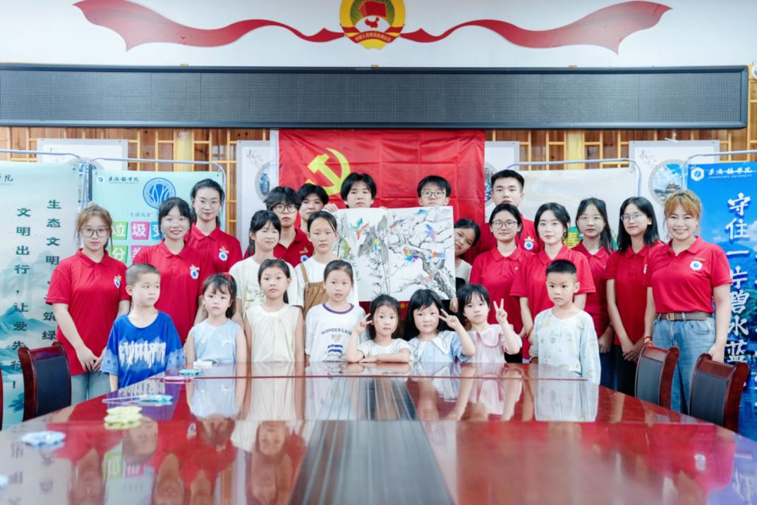 “轻轻走,不吵闹,花草树木对我笑;不乱画,不乱抛,美丽环境共照料...”实践队成员陆辰用幽默风趣的快板形式演绎了文明旅游知识,以更生动更直观的文艺形式向小朋友们讲述了如何争当文明践行者;危朝旭引导小朋友们在一抽一拉中体验非遗文化的魅力;刘必圣、张青遥、唐奕森、刘昕语带领小朋友们进行鸟类绘画涂鸦,并将成品粘贴于创作的山水画中,在美育中启发孩子们爱护自然,珍惜动物,共同守护地球家园。他们用孩子们喜闻乐见的形式,用交流拉近距离,用关爱温暖童心,加深了孩子们对生态保护的理解。