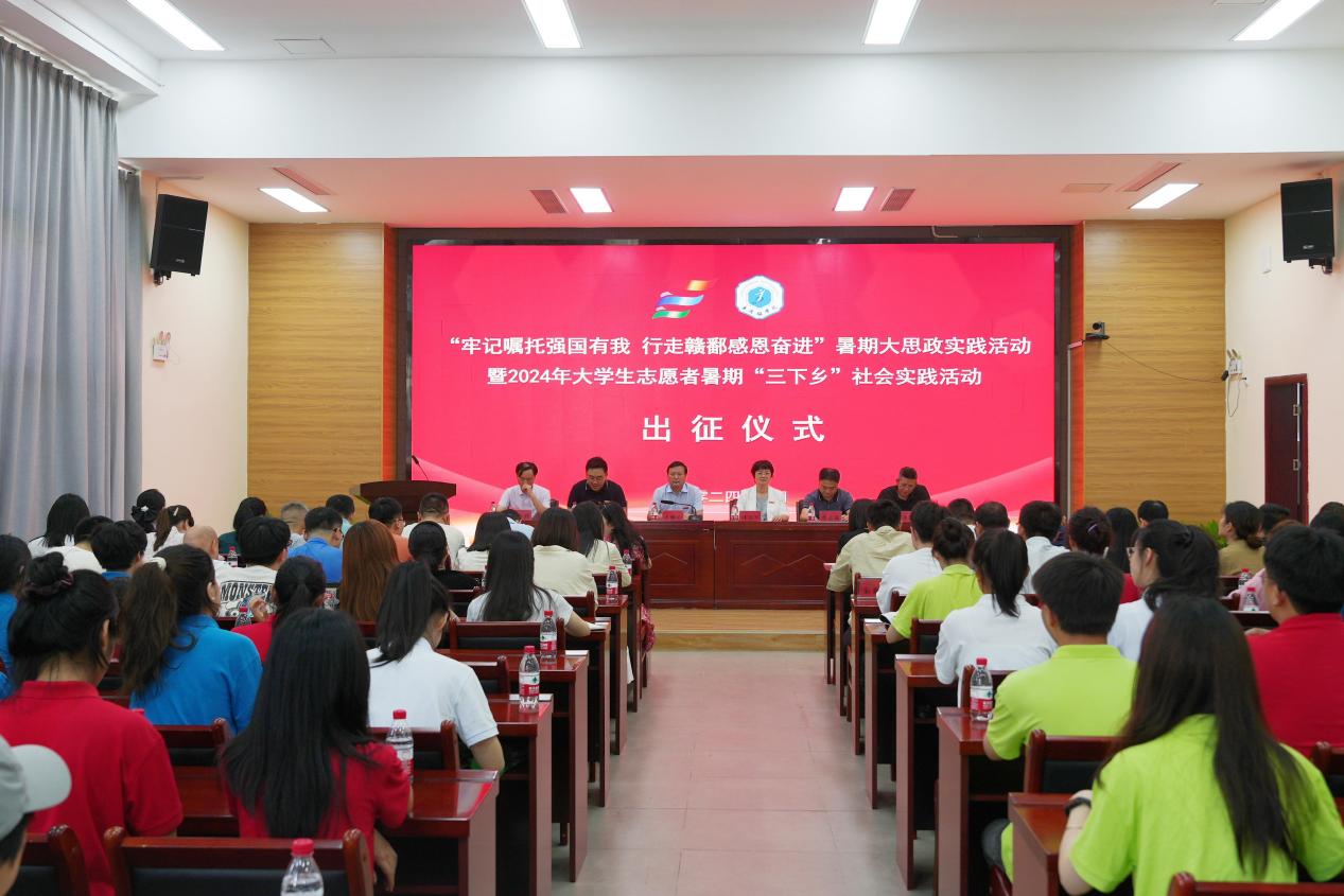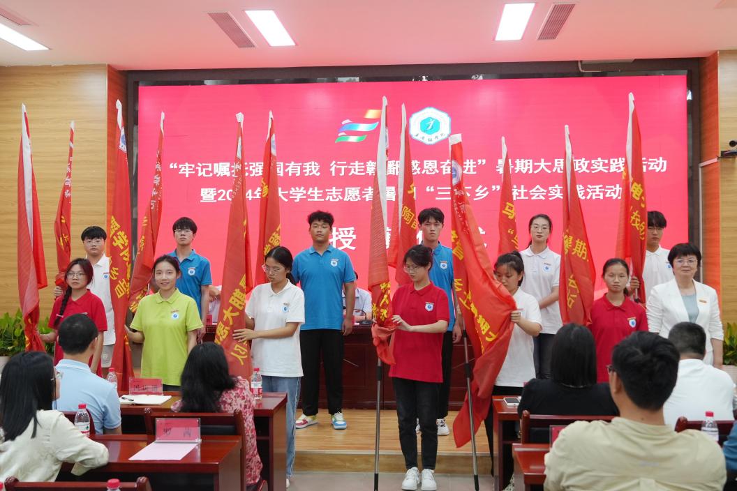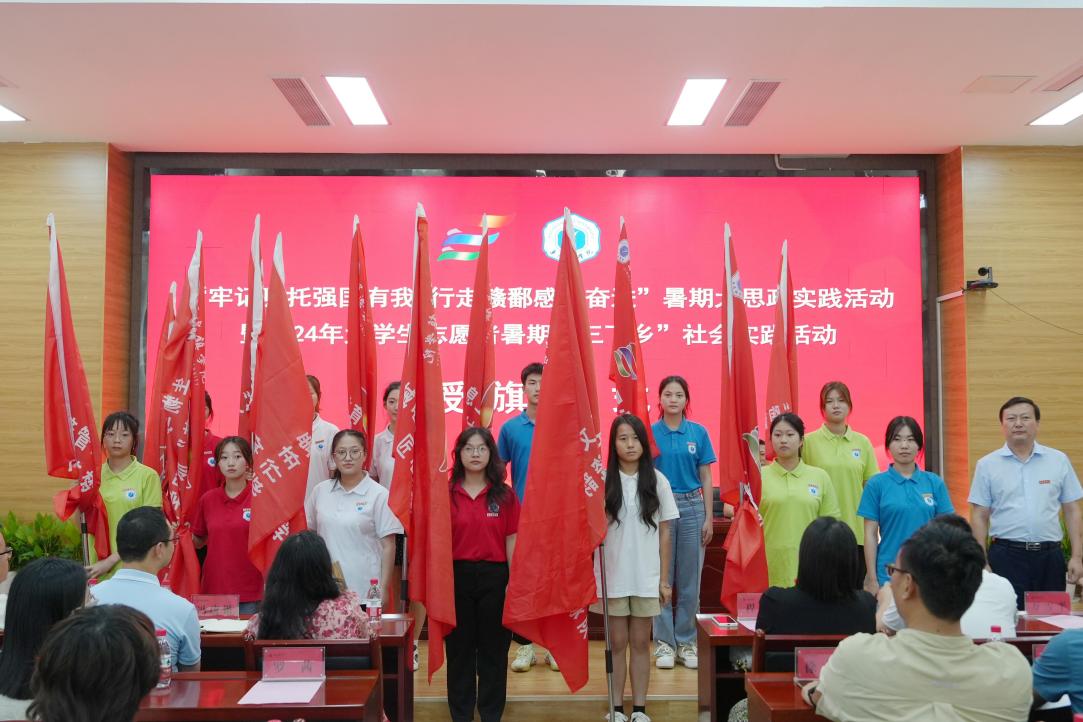 (本网讯:文|黄超/图|舒曼亮)7月3日下午,我校举行“牢记嘱托强国有我 行走赣鄱感恩奋进”暑期大思政实践活动暨2024年大学生志愿者暑期“三下乡”社会实践活动出征仪式。校党委副书记王丽心,党委委员、副校长周清平出席并为社会实践团队代表进行授旗,马克思主义学院院长曹志瑜、党委宣传部副部长汪万鹏、教务处副处长洪耀球出席,学工处(部)副处长(主持工作)赵新主持仪式。