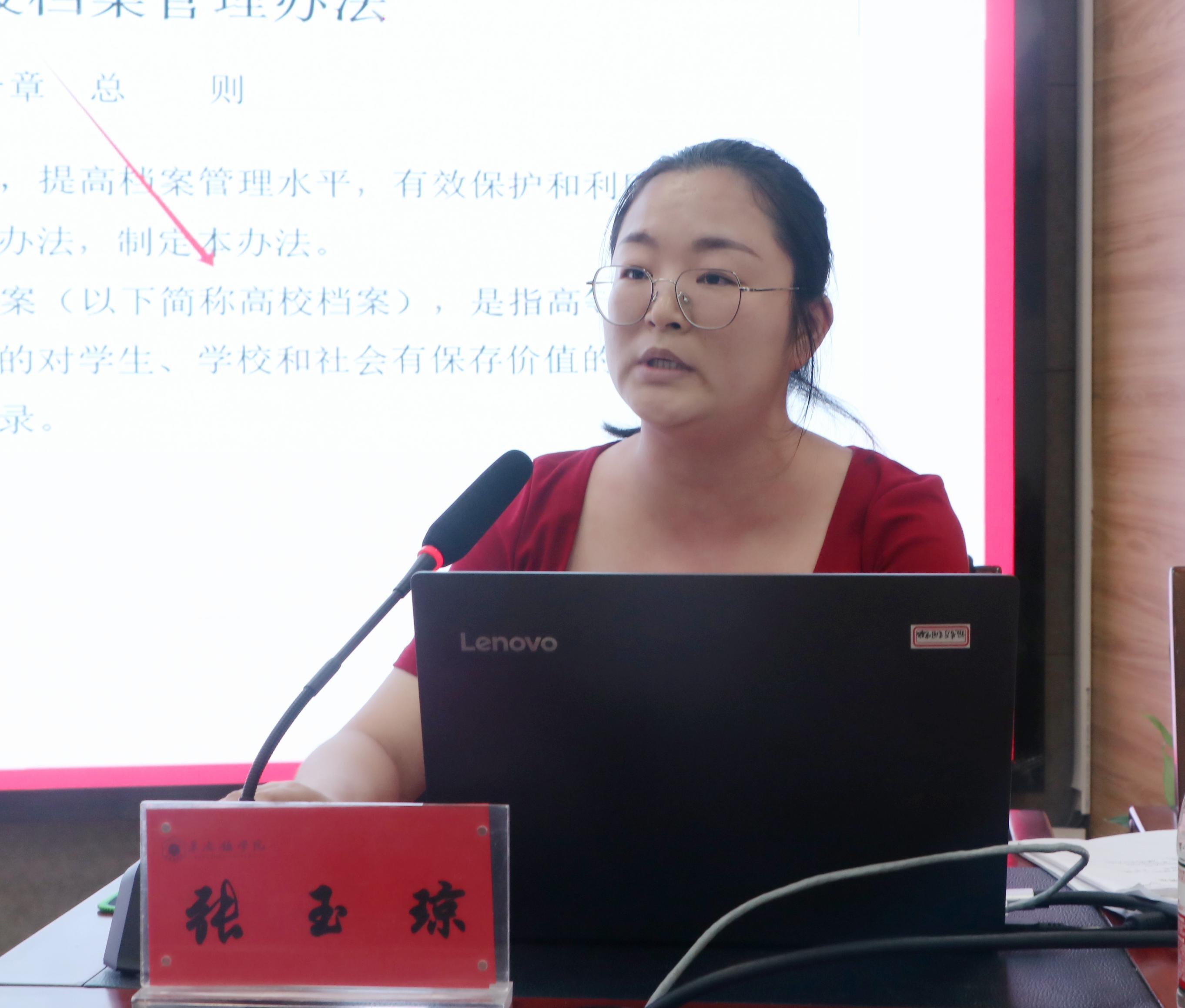 张玉琼以“‘档案收集和整理’知识学习”为题,以文书档案为例,结合我校档案工作实际,围绕档案工作的基本认识、档案收集的基本要求和归档文件整理规范三个方面进行讲授,对档案整理的各个流程进行了细致讲解。