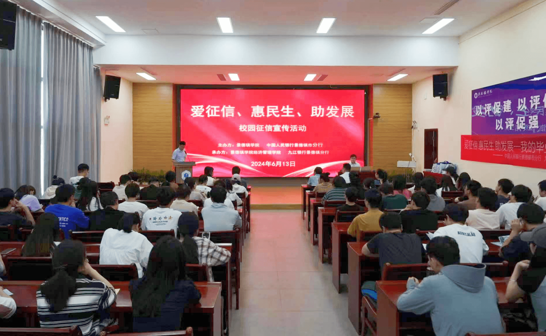 (本网讯:傅蕊蕊、吴紫瑶、曾雯莉)为进一步增强学生群体信用意识和风险防范能力,提升学生征信的社会认知度,6月13日下午,我校联合九江银行景德镇分行风险部在第一报告厅开展“爱征信、惠民生、助发展”的校园征信宣传活动。经济管理学院师生聆听宣传讲座。