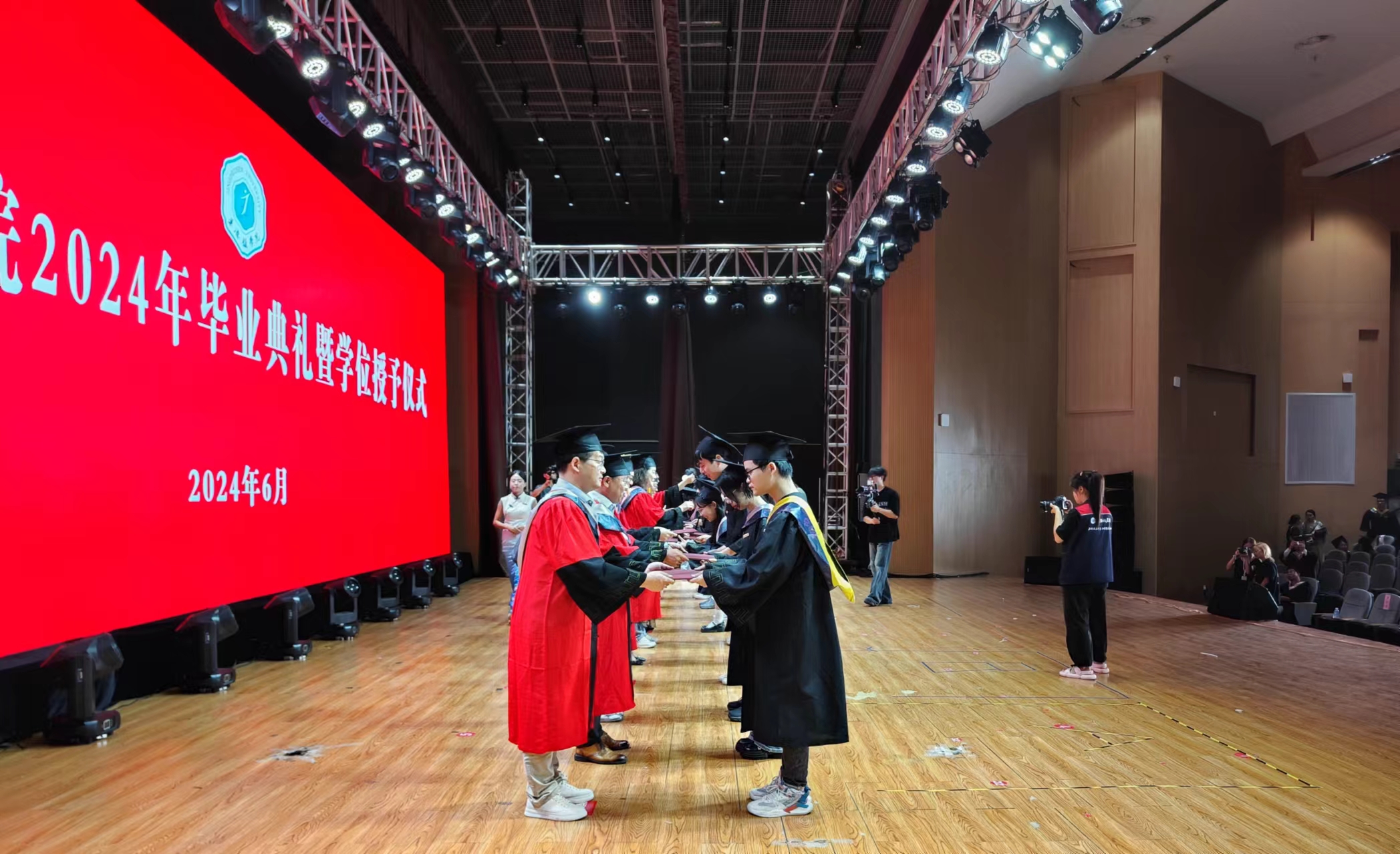 典礼上,王丽心为优秀毕业生颁发荣誉证书,郑昕芾以“云程发轫,培风图南”为题寄语毕业生,黄志坚宣读了《关于授予本科毕业生学士学位的决定》和《关于表彰2023届优秀毕业生的决定》。万文军向2024届校友联络员代表颁发聘书,校学位委员会委员们为获得学士学位的毕业生代表授予学位证书。