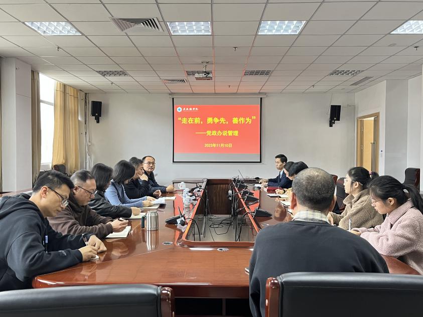 (本网讯:吕远茹)为学习贯彻习近平总书记考察江西重要讲话精神,达到学以致用的效果,11月10日下午,党政办公室在318召开“说管理”工作会议,党委委员、副校长方漫出席会议并讲话,党政办副主任程树武主持会议。