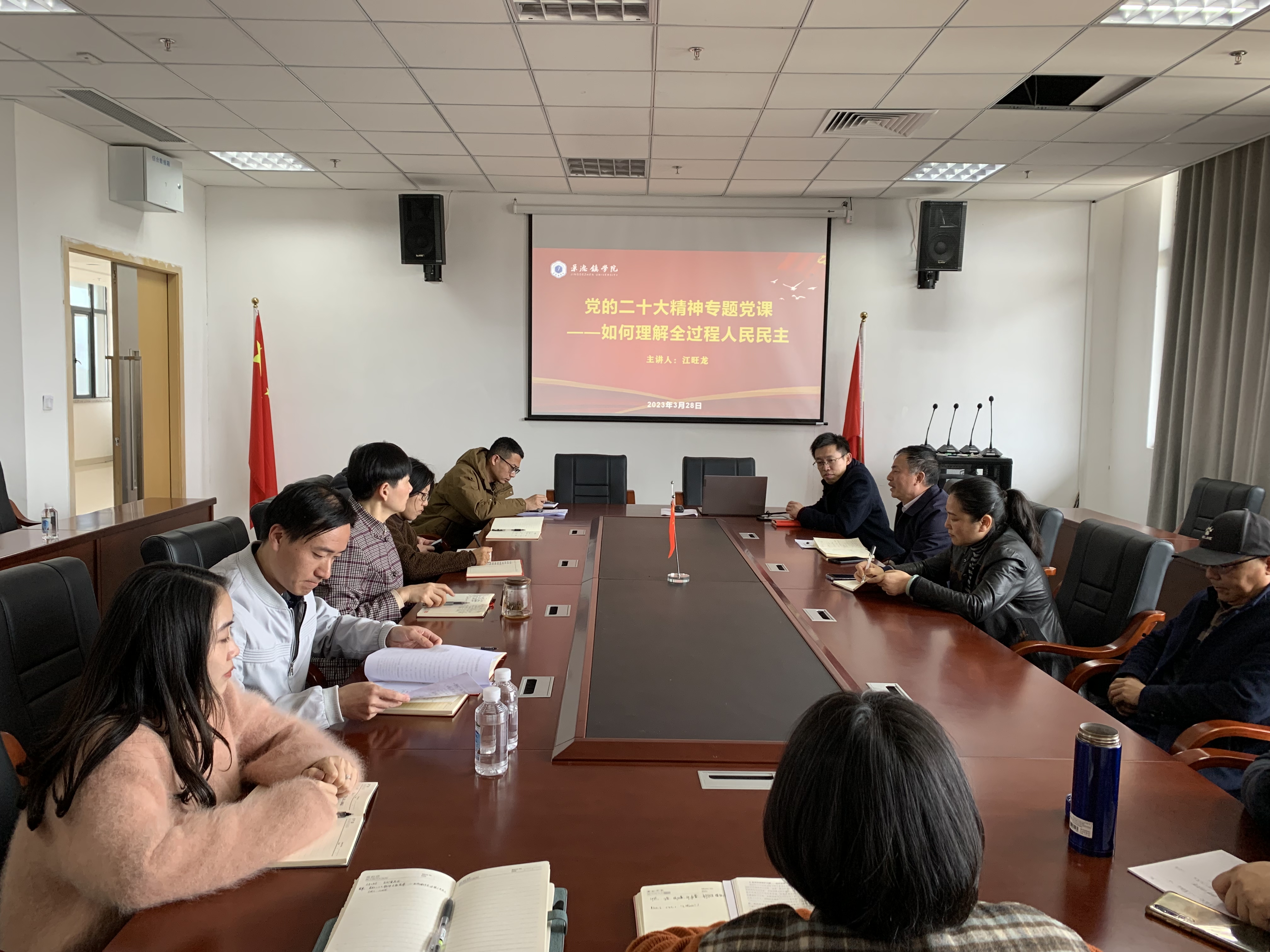 (本网讯:景苑轩)3月28日,机关九支部在新时代文明实践中心开展学习贯彻党的二十大精神专题党课,校党委委员、统战部部长万文军及支部党员参加党课,科研处处长江旺龙作主讲,机关九支部书记郑金江主持。