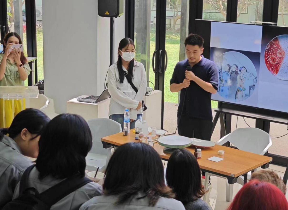 (本网讯:艺院轩)近日,我校陶瓷美术与设计艺术学院教师、泰国东方大学在读博士乐明亮,应泰国东方大学艺术学院邀请,在泰国bangsaen艺术节上举行陶瓷釉上彩绘工艺讲座,并与该院院长塞尚教授共同创作陶艺作品,开展陶瓷釉上彩绘示范现场教学。多国艺术家,泰国朱拉隆功大学代表团、泰国艺术大学代表团及泰国东方大学在读学生参加讲座。