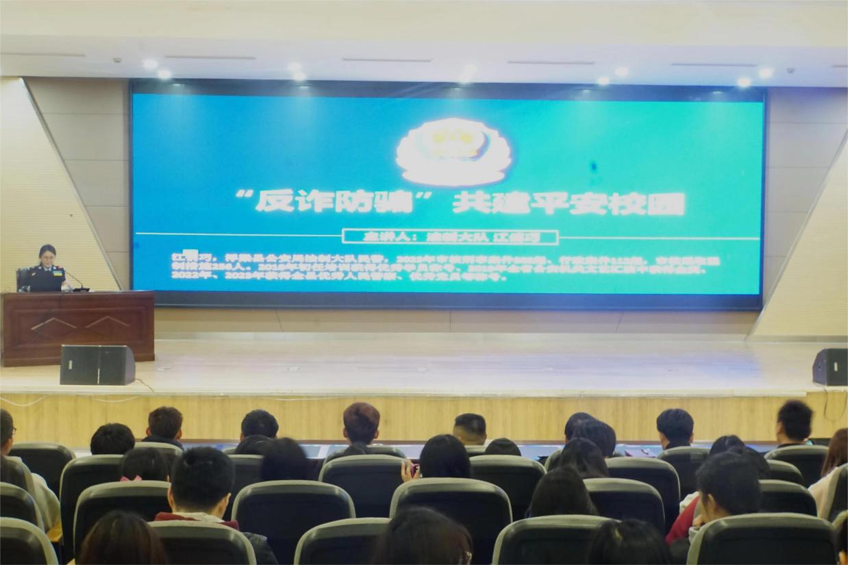 (本网讯:童玉婷、吴紫瑶)为切实加强反诈骗宣传教育,保障广大师生财产安全,提高全体师生识骗防骗能力,构建平安校园,3月11日下午,我校在图文报告厅开展“开学第一课之安全教育课”,景德镇市浮梁县公安局法治大队民警江俏巧以“‘反诈防骗’共建平安校园”为题为师生讲授了一堂生动的安全教育课。校保卫处处长谢晓良主持。