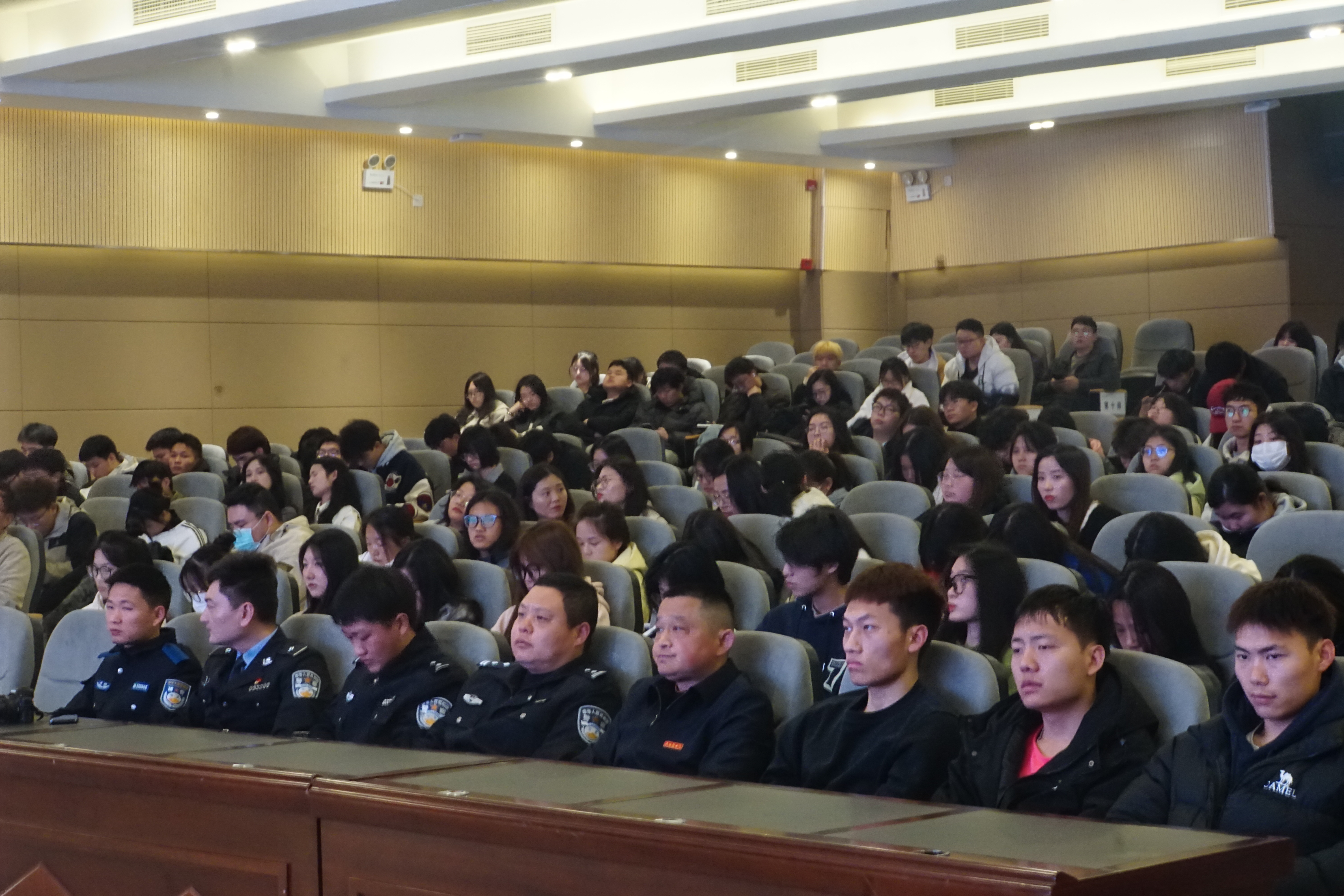 校党委学生工作部(处)、保卫处,新平派出所,景德镇市浮梁县公安局出入境管理科、县公安局国保大队、县公安局网安大队和县公安局禁毒大队的相关负责人和师生代表参加讲座。