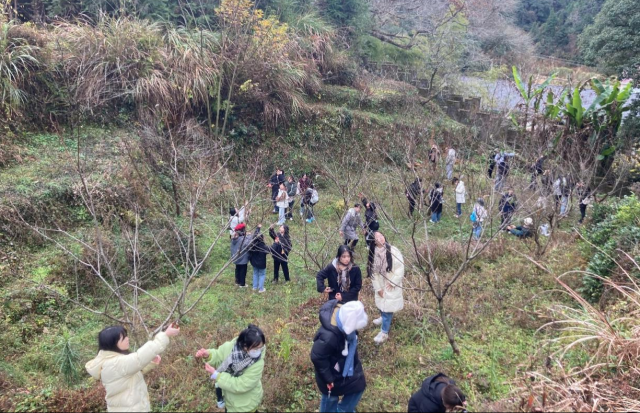 此次劳动教育活动内容主要是为村中的桃树进行修剪,在生环学院青年教师叶林江博士和余义亮老师的带领下,2022级风景园林1班的全体学生满怀热情奔赴村中桃树林。浮梁县蛟潭镇胡宅村村支部书记胡永久和学校驻村工作队队长、驻胡宅村第一书记舒新兴教授对生环学院师生表示欢迎并发表讲话,为整个活动拉开序幕。