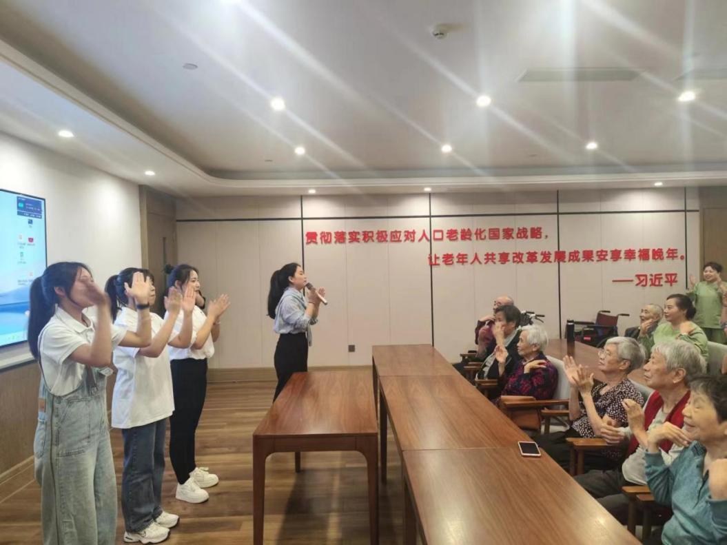 音乐舞蹈学院陈国平博士以一首经典的《红莓花儿开》活跃了全场氛围。随后,音乐舞蹈学院教师董帅带领Healer音乐疗愈服务队成员开启银杏音乐疗愈群体活动。活动中,志愿者们带领老人们进行了拍拍操,让老人们的身体得到了锻炼,在轻松愉快的氛围中增进了彼此的交流。在经典歌曲回忆环节,志愿者们播放了《学习雷锋》《歌唱祖国》等歌曲,老人们在熟悉的旋律中积极跟随示范,主动进行言语、动作的交流,仿佛回到了年轻时的岁月。
