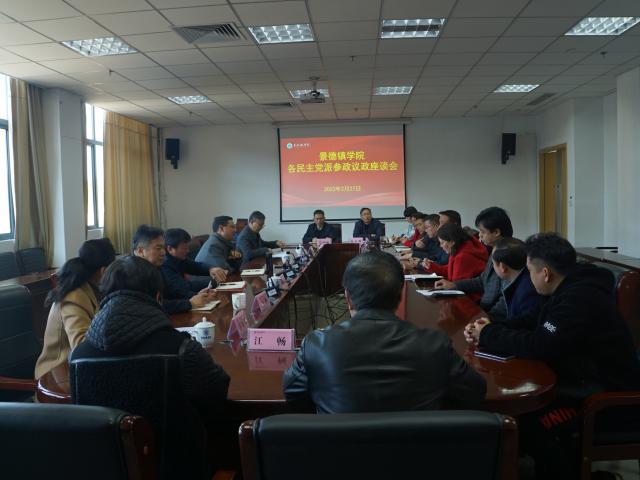 (本网讯:欧阳佳丽、欧阳晰、刘雪松)2月27日下午,我校在行政楼318会议室召开各民主党派参政议政座谈会。校党委书记叶观荣,党委副书记、校长陈运平,党委副书记王丽心,党委委员、纪委书记李新荣,党委委员、副校长方漫出席会议,会议邀请第十四届全国人大代表王安维、第十二届景德镇市党代表汪开潮和市第十四届政协委员钟振华参加。党委委员、统战部部长万文军主持会议。