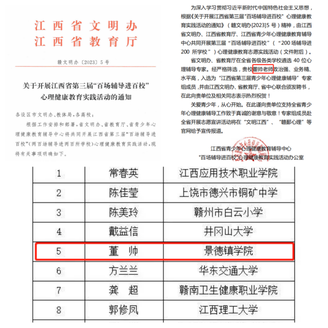 (本网讯:学工轩)根据工作安排和部署,省文明办、省教育厅、省青少年心理健康教育辅导中心将共同开展江西省第三届“百场辅导进百校”(两百场辅导进两百所学校)心理健康教育实践活动。按统一选拔标准,全省共398位老师报名申请参加第三届“百场辅导进百校”活动,经过活动组委会办公室审核教师资质,共选拔40名业务能力强、教学效果好、热心公益的心理健康教育教师。我校董帅老师成功入选“江西省第三届青少年心理健康辅导”专家组成员!