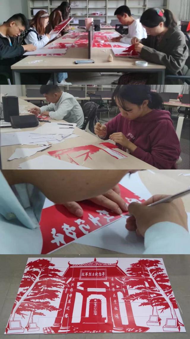 在实地走读的过程中,队员们还来到了瑞金市叶坪乡华屋村,村里有十七棵高大挺拔的松树直入云霄,十七颗松树被华屋村村民称之为烈士“信念树”,每一棵“信念树”代表每个烈士的英魂,表达了村民们对17位英烈的怀念和对革命信念的坚定。队员们将专业特色与思政内容相结合,以“十七颗松精神”为主题,运用中国传统剪纸工艺与江西红色文化交融碰撞形成《致敬·十七颗松精神》红色剪纸作品。作品由36块剪纸拼接而成,总长约2.4米宽约1.5米,轻薄的纸张承载着厚重的精神文化底蕴,表达了大家对红色文化时代价值的深刻理解。