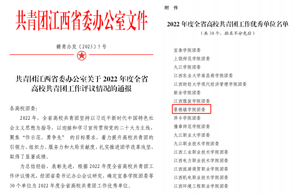 (本网讯:黄超)近日,共青团江西省委办公室通报了2022年度全省高校共⻘团工作优秀单位名单,我校团委在全省高校中荣获“2022年度全省高校共⻘团工作优秀单位”,是我校继2021年度之后再次获此殊荣!