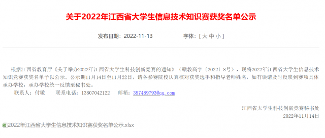 (本网讯:信工轩)近日,2022年江西省大学生科技创新竞赛信息技术知识竞赛获奖名单在江西省教育厅官网完成公示,我校学子荣获江西省本科专业组一等奖1项、二等奖4项、三等奖13项;本科非专业组一等奖1项、二等奖4项、三等奖5项,共计28个奖项的好成绩。