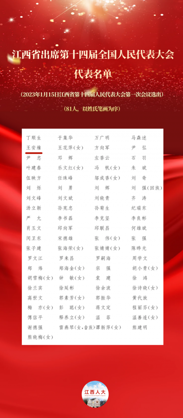 (本网讯:景苑轩)1月15日上午,省十四届人大一次会议举行第三次全体会议,大会选举产生了81名江西省出席第十四届全国人民代表大会代表。我校王安维教授当选第十四届全国人大代表。