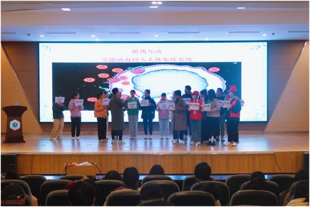 谈际震结合自身十年防艾工作经验,围绕“艾滋病国际及国内形式”“艾滋病致病机理及传播途径”和“如何有效预防艾滋病”三个方面,通过真实典型案例,生动形象地讲解了艾滋病防治的相关知识。通过游戏互动,引导同学们从多种角度认识艾滋病病毒侵入人体免疫系统的过程。