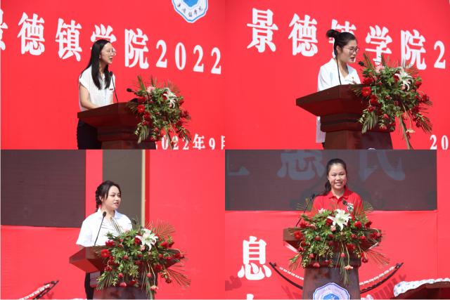 典礼上,教师代表信息工程学院李珍真,老生代表陶瓷美术与设计艺术学院2019级艺术教育专业高海萍,新生代表经济管理学院2022级电子商务专业刘曼娴分别上台发言。外国语学院2011届毕业生程风作为优秀校友代表发言,她向母校表达了衷心的感谢与美好的祝愿,并分享了自己的景院生活和成长经历,希望同学们在大学生活中能奋勇拼搏,砥砺前行,努力成为一名优秀的景院人,为实现中华民族伟大复兴的中国梦贡献青春力量。