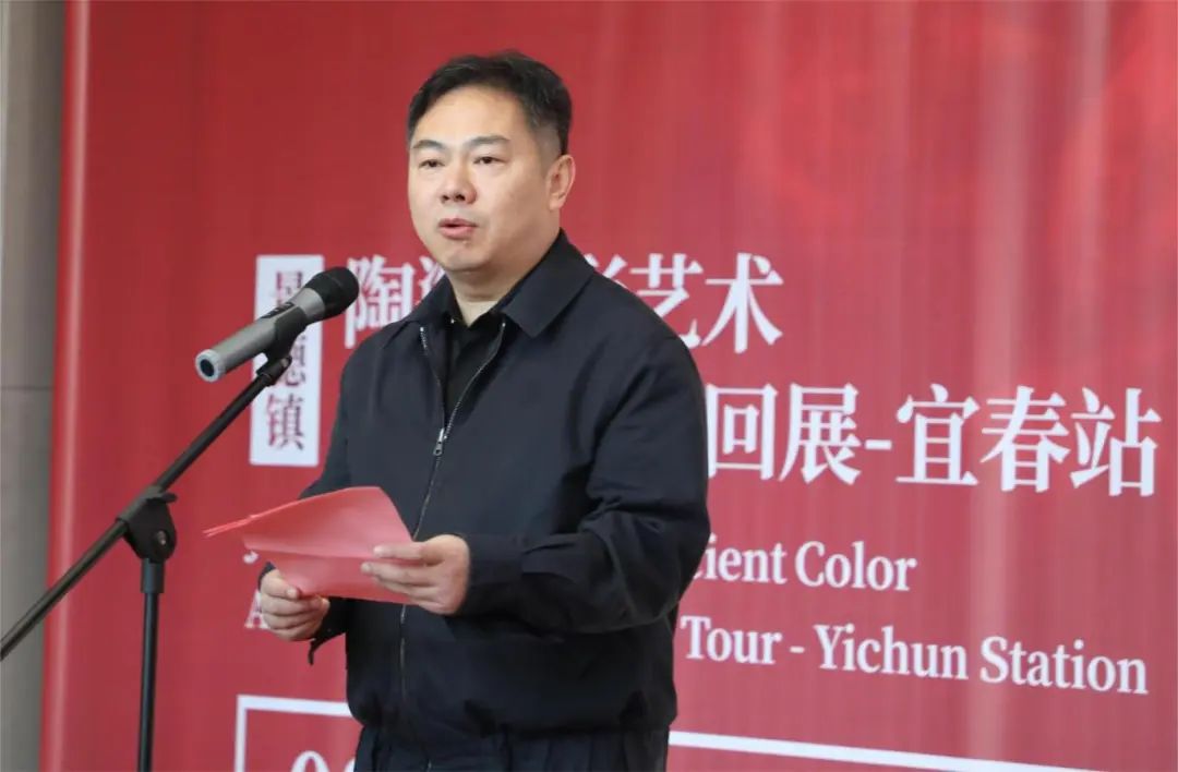 彭金平在致辞中指出,要以习近平文化思想为指引,不断弘扬中华优秀传统文化,推动陶瓷艺术的薪火传承。他表示,此次展览“好古知时、薪火赓续”的主题正是体现了景德镇陶瓷产业传统与现代相结合的精神内涵。这不仅是一次作品展示,更是对陶瓷古彩艺术理论、技艺、材质和工艺的全方位呈现。与此同时,展览也为宜春市民提供了了解和欣赏陶瓷古彩艺术的平台,为推动景德镇与宜春两地的文化交流合作发挥了促进作用。