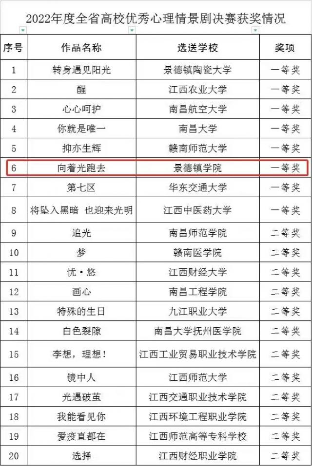 (本网讯:学工轩)12月4日,由省委教育工委、省教育厅联合举办的2022年江西省全省高校优秀心理健康情景剧决赛结果揭晓,我校心理教育中心推送作品《向着光跑去》经历激烈角逐,荣获一等奖。