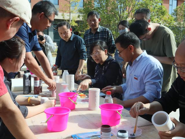 叶观荣、王丽心、李新荣为本次活动点火启幕并体验实践创作,艺术学院的老师带领大家进行现场创作,大家充分发挥想象力与创造力,在陶胚上勾勒出极具艺术性的精美图案,作品顺利完成后进入了入窑阶段,师生作品共入窑火。
