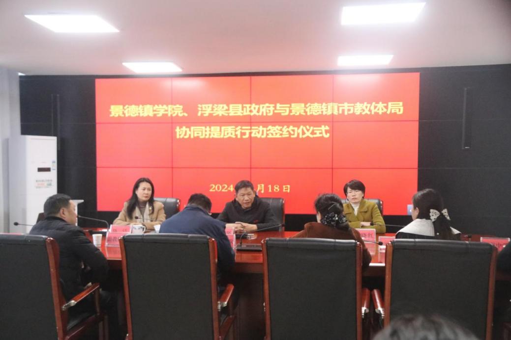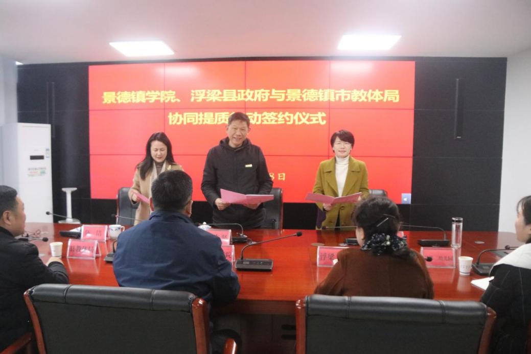 (本网讯:曾娟玲)近日,我校与浮梁县政府、景德镇市教体局在浮梁县县政府大楼共同召开协同提质行动三方框架协议签订会,副校长黄志坚、教务处负责人司春灿及景德镇市教育局、浮梁县县政府协同提质行动试点学校等单位负责人参加会议。