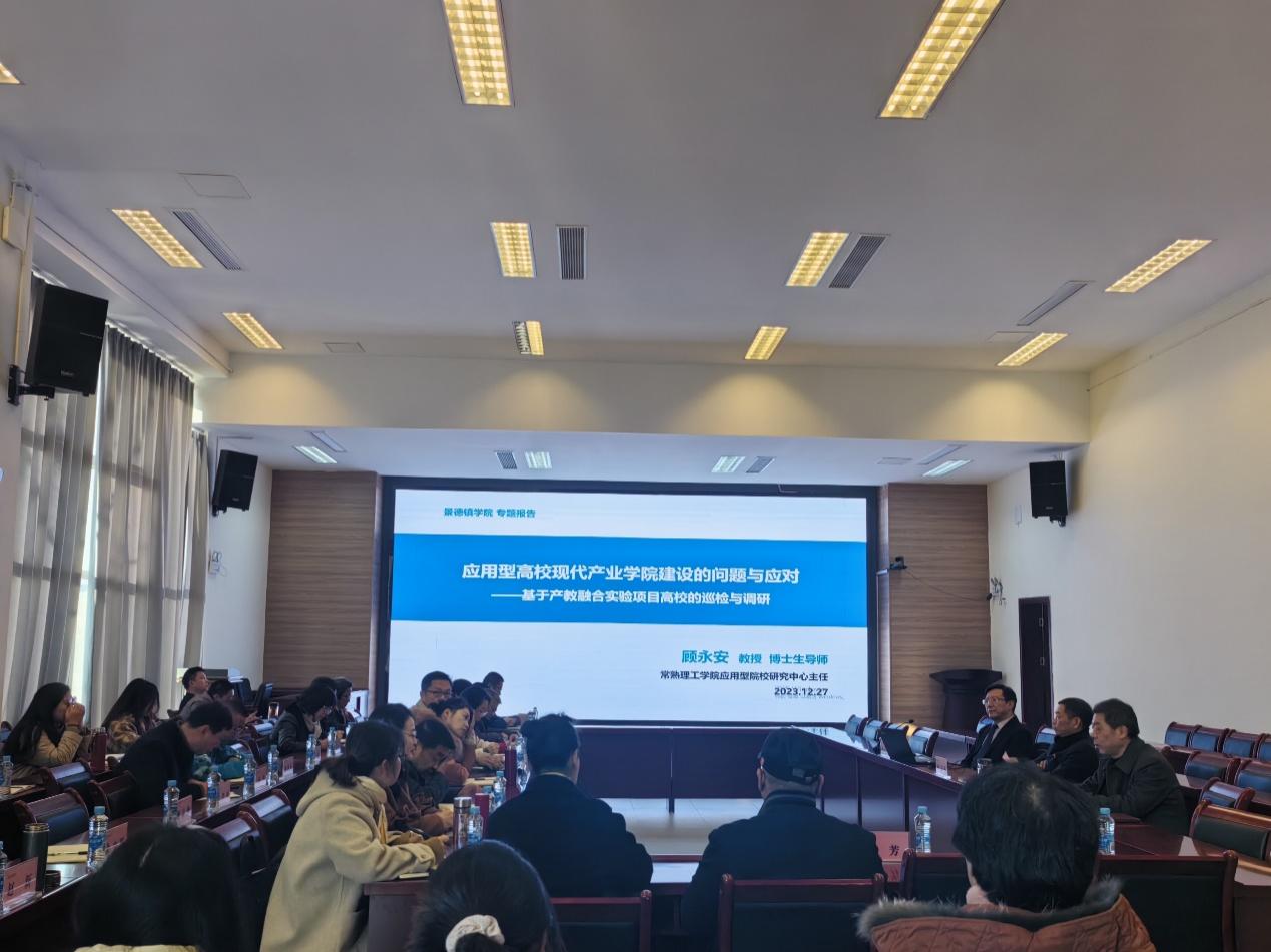 (本网讯:校报记者周可玮、曾梦婷、江珍燕、黄颖)为全面推进我校应用转型,加快现代产业学院建设,扎实推进校地、校企、校产融合,12月27日,我校举办“如何建设现代产业学院”专题讲座,常熟理工学院应用型院校研究中心主任顾永安教授应邀来校做分享,党委副书记、校长陈运平出席,党委委员、副校长郑昕芾主持讲座。