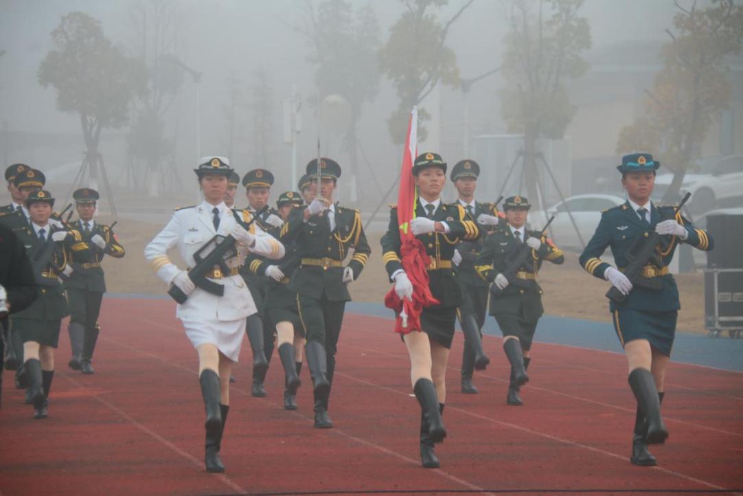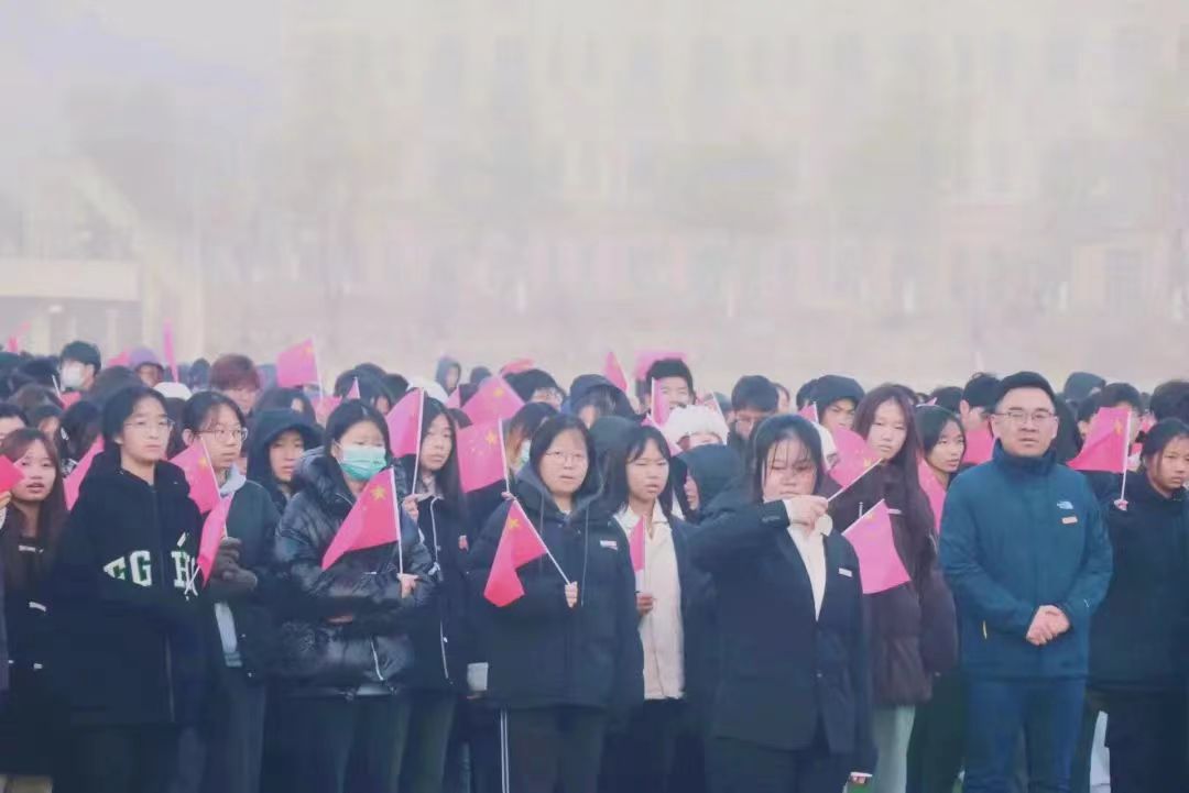 在迷蒙的晨雾中,英姿飒爽的国旗护卫队护送鲜艳的五星红旗迎面走来,伴随着庄严的《义勇军进行曲》,五星红旗冉冉升起,迎风飘扬,在场全体人员向国旗行注目礼,深怀对祖国无限的热爱和崇高的敬意。