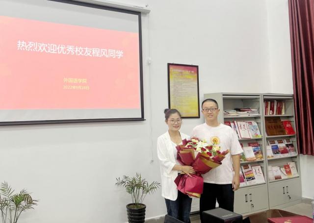 (本网讯:余珊珊李文倩)9月28日上午,外国语学院特邀优秀校友杰出代表程风来我院指导工作并作个人成长经验分享会。外国语学院党委书记吴芹、院长朱练平及班子成员和师生代表出席分享会。分享会由副书记黄华主持。