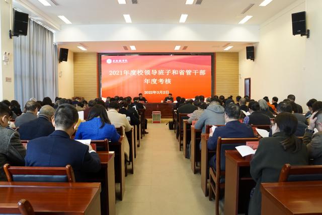 (本网讯:刘斌权蔡新雅邓舒馨)3月2日下午,学校在一号报告厅召开学校领导班子和省管领导干部2021年度考核民主测评会,省委第十一考核组组长、省人力资源与社会保障厅党组成员、副厅长叶志忠,考核组成员李雷、丁杰、姜娜、邓兵、王邻、周卫明、周浩、许枇枇、余亮、吴智扬、罗吟吟等一行12人出席会议。校党委副书记、校长陈运平主持会议。校领导、中层正职、正高人员代表和其他教职工代表参加会议。