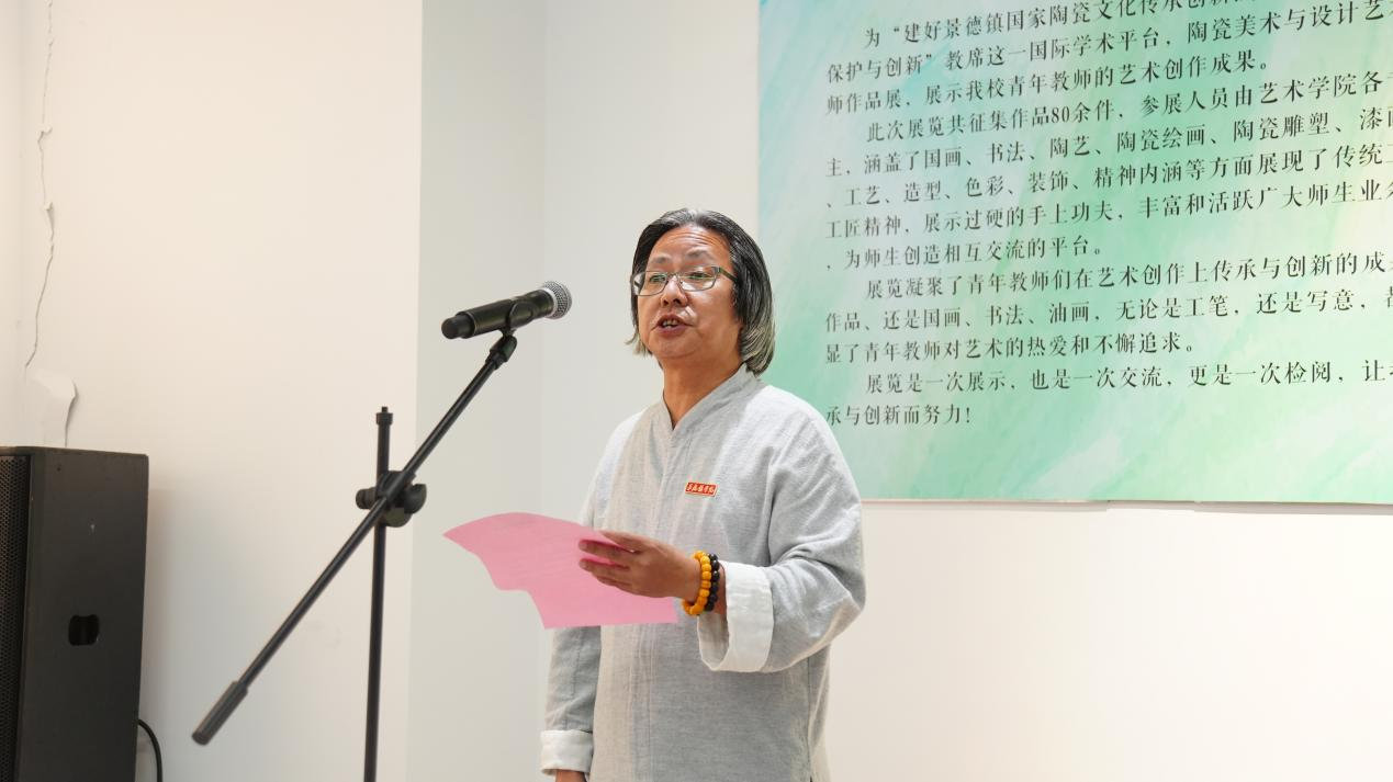 张博在致辞中表示,希望陶瓷美术与设计艺术学院青年教师能够充分发挥联合国教科文组织“陶瓷文化保护与创新”教席这一国际学术平台,围绕景德镇陶瓷文化传承与创新试验区工作建设,全方位展示自身的综合实力和风采风貌,以艺为器,以匠为道,力求以文化为导向,融合传统与当代思潮交互共生,建构新时代风格体系,赋能手工艺产业新使命,实现青年一代应有的使命与担当!