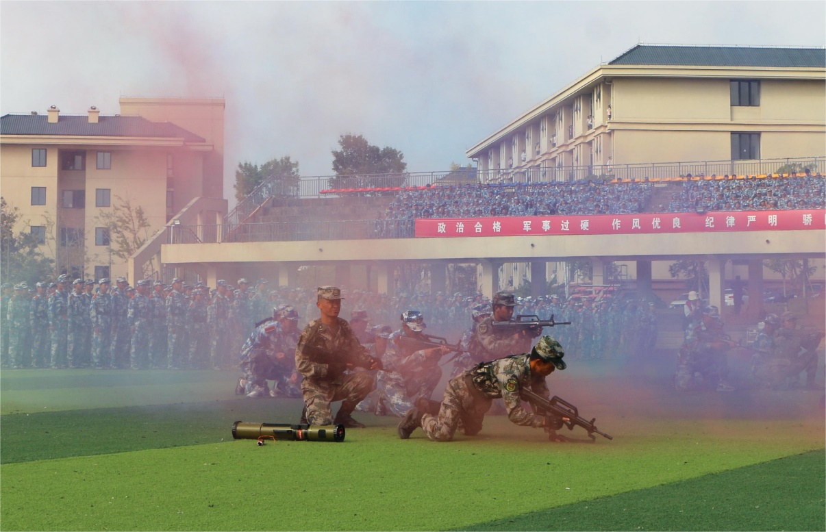 千名景院学子组成的军体拳方队精彩亮相,一击一打,一步一踏,干净利落的动作淋漓尽致地彰显出青春本色。随后,匕首操被学子们精准有力呈现,英姿飒爽的他们高喊着“杀”字,响彻云霄,一招一式令人赞叹。接着,烟雾四起,教官们身穿迷彩服,以坚毅的目光和铿锵有力的动作,在紧张的氛围中展现精湛的演练。迷彩映空,英姿飒爽。整个汇演不仅是一场震撼人心的视觉盛宴,更是对景院学子优秀军训成果的生动展示。