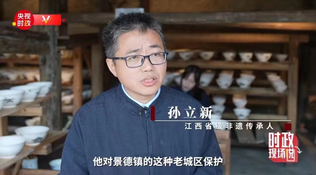 在考察现场,习近平总书记还驻足观看了景德镇学院优秀校友孙立新创作民间婴戏青花瓷碗的过程。能够近距离接触习近平总书记,孙立新感到非常激动。他回忆道:“当看到习近平总书记来到我们工作场地时,我内心非常欣喜,总书记亲切地询问我这是在画什么?他亲和的话语让我感觉心里很温暖,随后我为总书记现场演示了绘制民间婴戏青花瓷碗。我迅速把青花料调好,用笔飞速地把图案画出,全程约20秒不到,画了一个‘婴戏欢歌’,(儿童)一手持竹枝,寓意节幸福生活节节高。‘画得这么娴熟,应该画过上万个吧?’习近平总书记亲切地问到。我向总书记汇报了我作为陶瓷世家孙公窑第四代传承人,13岁学艺、从事陶艺事业40多年的经历。‘有传承,画得好。’习近平总书记边鼓掌边鼓励我,温和的话语抚平了我紧张激动的心,让我真切感受到习近平总书记对人民深切的关怀。”