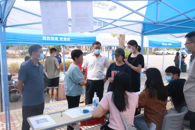 叶观荣详细了解学生入校基本流程,实地查看报到区、核酸检测点、学生公寓、食堂等。了解返校学生体温测量、防疫健康信息扫码登记等环节工作开展情况。