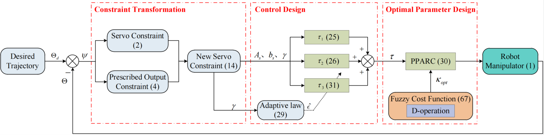 具有良好的轨迹跟踪控制性能是机械臂的基本要求之一,然而在实际情况中,不确定性不可避免存在,并且会降低机械臂系统的控制性能,如何设计高效的控制策略保证机械臂在不确定影响下实现高速、高精度的轨迹跟踪控制具有重要的工程应用价值。基于伺服约束的观点,本文研究了具有不确定性的机械臂的预设性能自适应鲁棒控制。首先,利用预设性能函数对系统跟踪误差进行约束。其次,结合状态转换函数使系统跟踪误差的预设性能约束问题转换为一个新的系统变量的有界性问题。最后,考虑到系统控制性能和控制输入成本之间存在权衡,利用模糊集理论对不确定进行描述,并基于此,探索了控制器的参数优化问题。