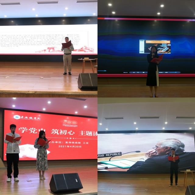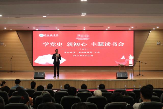 (本网讯:文|李婷婷、刘飞燕/图|琚知宸、王梦茹、李梦)4月20日晚,我校在图文报告厅举办“学党史,筑初心”主题读书会。校党委副书记王丽心,校党委委员、纪委书记李新荣,校党委委员、宣传统战部部长方文龙,工会主席陈树发,艺术学院党总支书记赵雪政,宣传统战部副部长程桑等出席读书会。