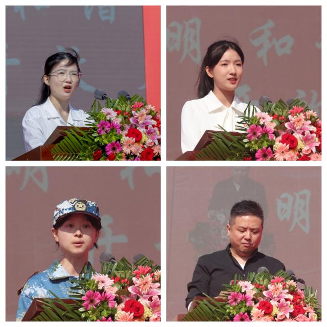 典礼上教师代表、机械电子工程学院刘婷玉,老生代表、教育学院戴方晴,2023级新生代表、生物与环境工程学院黄筱晓,陶瓷美术与设计艺术学院2000届校友代表罗恒分别发言。