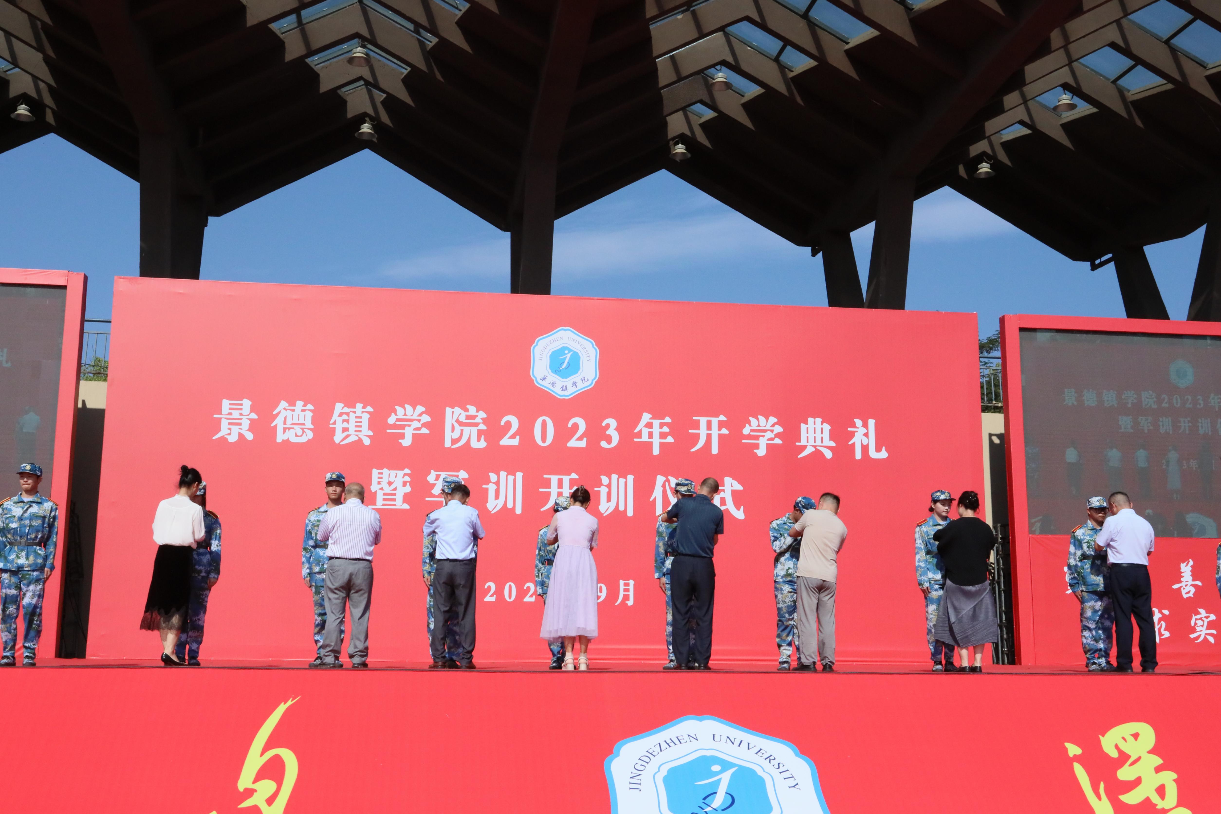 各二级学院院长为2023级新生代表佩戴校徽,红底金字的“景德镇学院”别在青年们的胸前熠熠生辉,激励着莘莘学子传承“自强不息泽土惠民”的校训精神,融入景院大家庭。