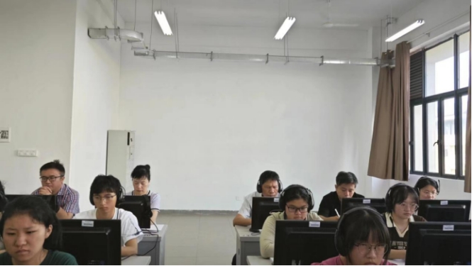 副校长黄志坚(中)在副教授吴俊芳的《英语视听说Ⅱ》课上听课校报记者 何远梅摄