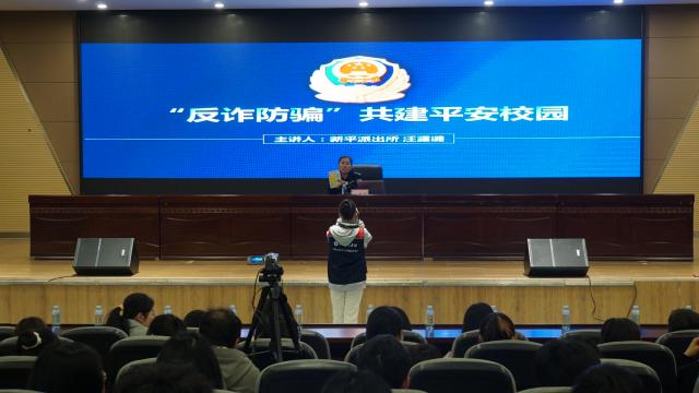 (本网讯:文|李明雨、游好/图|吴苏丹、张金栋)为增强大学生反诈防骗意识,切实维护学生财产安全。3月23日晚,我校在图文报告厅举办“反诈防骗,共建平安校园”专题讲座。浮梁县公安局新平派出所民警汪露璐应邀主讲,保卫处处长谢晓良主持。