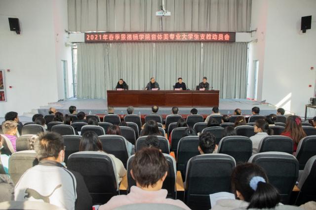 (本网讯:洪耀球)3月10日上午,我校2021年春季音体美专业大学生支教动员会在第二报告厅召开,校党委委员、副校长吴丁,景德镇市教育局党委副书记胥慧强出席动员会,教务处、艺术学院、教育学院、体育学院、浮梁县、乐平市、昌江区教体局领导、受援学校代表及全体支教学生参加会议。会议由教务处副处长余康发主持。