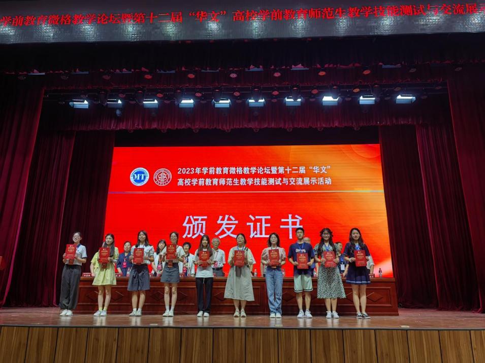 (本网讯:张雪祺)近日,由中国教育技术协会微格教学专业委员会举办的2023年学前教育微格教学论坛暨第十二届“华文”高校学前教育师范生教学技能测试与交流展示活动圆满结束。教育学院选派的六名学生在这一次学前教育师范生教学技能测试大赛中取得优秀成绩,在教学设计和教学能力两个奖项中,获一等奖1项,二等奖3项,三等奖8项。