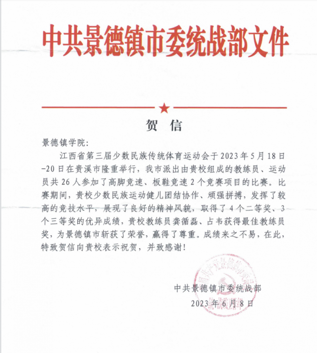 6月8日中共景德镇市委统战部特意发来贺信向我校学生和教练团队表示祝贺!贺信对我校少数民族运动会健儿比赛期间团结协作、顽强拼搏精神给予高度赞扬和肯定。并希望我校青年学生向少数民族同学学习,团结协作、发扬勇于拼搏、敢于胜利的精神,激扬青春梦想,谱写人生华章!